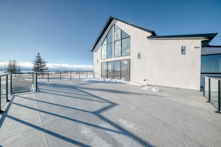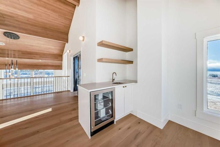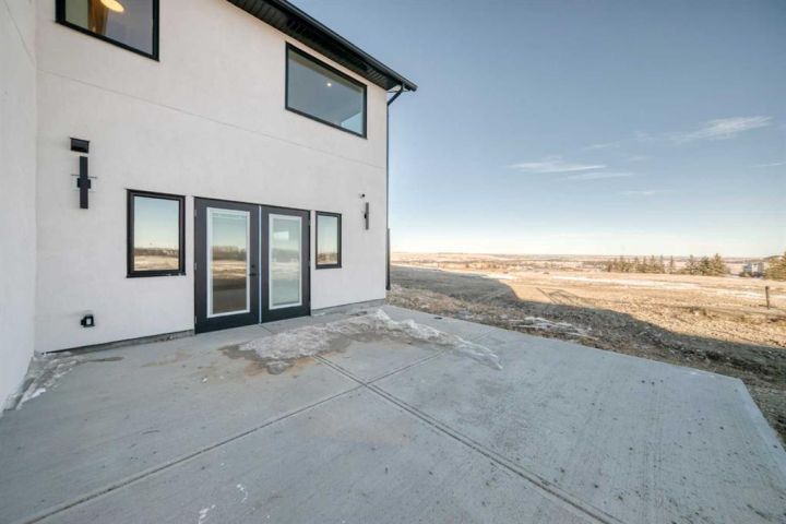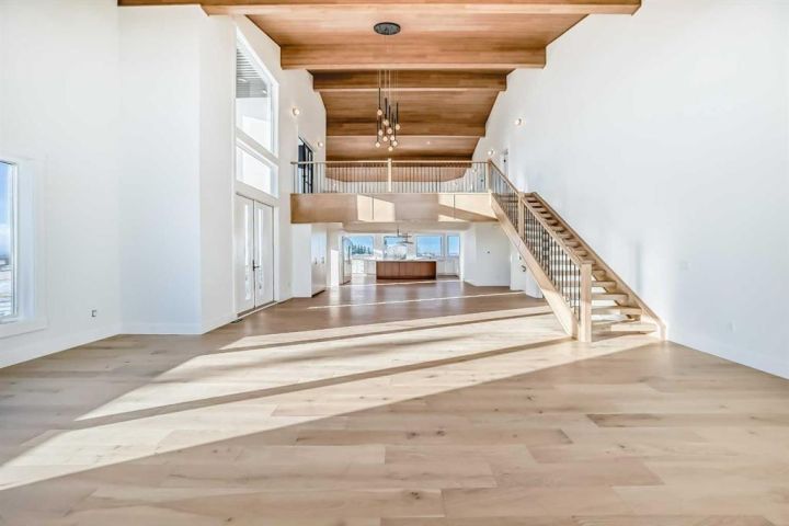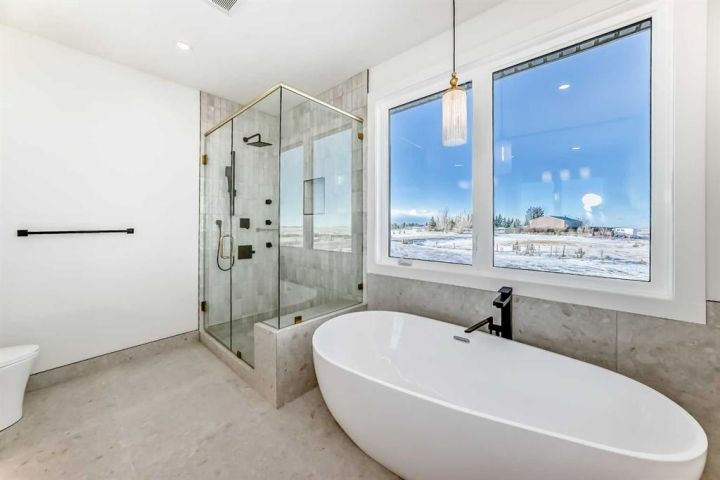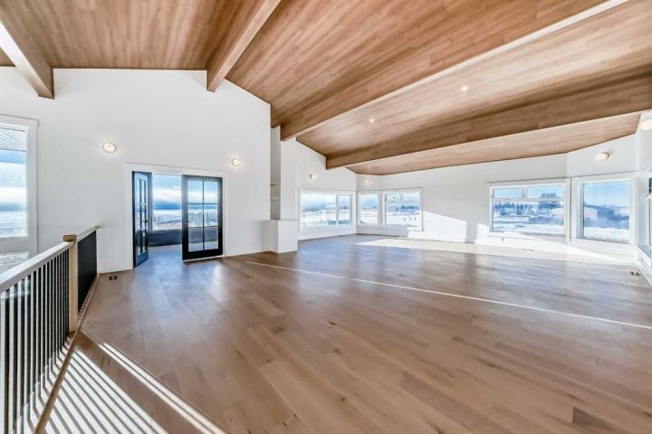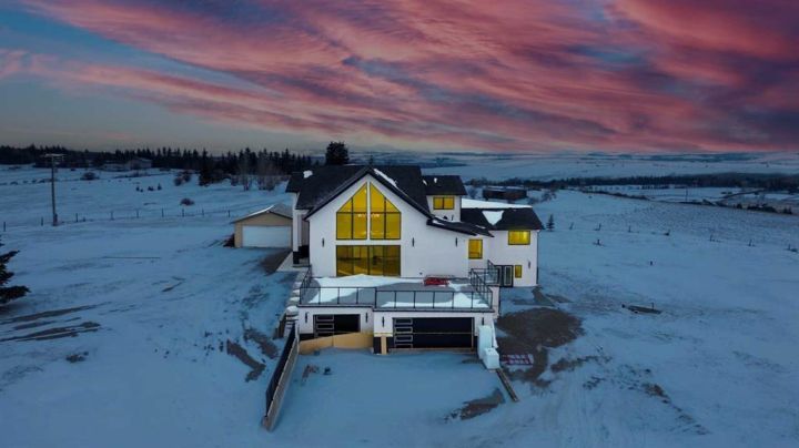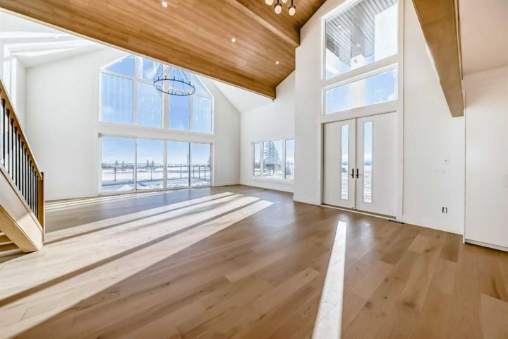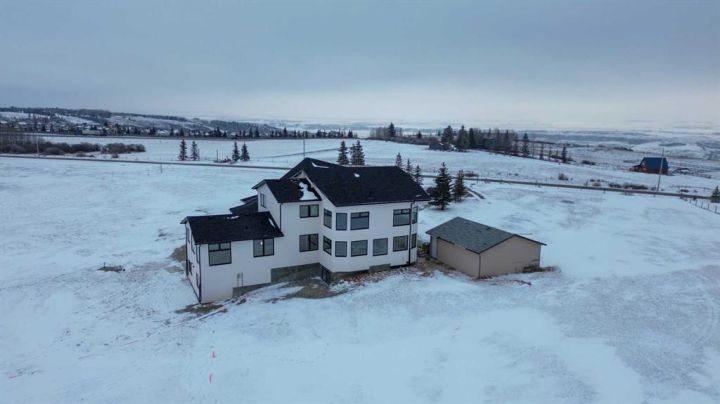 WELCOME TO THIS EXCEPTIONAL, FULLY RENOVATED ACREAGE set on over 4 acres just minutes from Cochrane, offering unobstructed 360° panoramic views of the Rocky Mountains and the Cochrane valley. Located in a quiet, cul-de-sac-style acreage community, this remarkable property provides privacy, peace, and minimal traffic—ideal for those seeking a refined country lifestyle with city convenience nearby. This striking 1.5-storey residence offers over 6,600 sq. ft. of total living space including a fully developed walk-out basement, delivering exceptional functionality for families, entertaining, and flexible living arrangements. The main level impresses with vaulted ceilings, exposed wood beams, and expansive windows that flood the home with natural light while perfectly framing the breathtaking views. The west-facing kitchen features high-end appliances, ample cabinet space and premium finishes—ideal for both everyday living and entertaining while enjoying spectacular sunsets and mountain views. The open-concept living and dining areas create a warm, inviting atmosphere. The main-floor primary retreat is complete with large windows showcasing the scenery and a luxurious 5-piece ensuite featuring a soaker tub, walk-in shower, dual vanities, and elegant finishes. A spacious second bedroom, a stylish 4-piece bathroom, convenient main-floor laundry, and a flexible den or office space complete this level. The upper floor offers an expansive bonus room with ample space for lounging, games, or a pool table. A bright sunroom, a 3-piece bathroom, and a dedicated flex space ideal for a home office, reading area, or hobby room round out this level, providing additional areas for relaxation, work, or creativity. The fully finished walk-out basement includes a large recreation room, a bedroom with a walk-in closet and 4-piece ensuite, a 2-piece bathroom, a laundry area, and a mudroom with exterior access—making this level ideal for guests, extended family, or added convenience. Outside, enjoy wide open views, ample parking, and excellent storage with a triple attached garage plus a double detached garage. The acreage offers great flexibility and future potential and may be suitable for short-term or vacation rentals, small event hosting, or agricultural and hobby use. A rare opportunity to own a fully renovated acreage with over 4 acres of land, a finished walk-out basement, and incredible views—all just minutes from Cochrane. Book your private showing today.