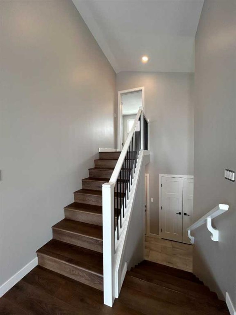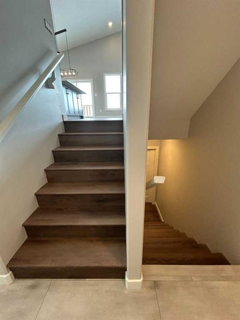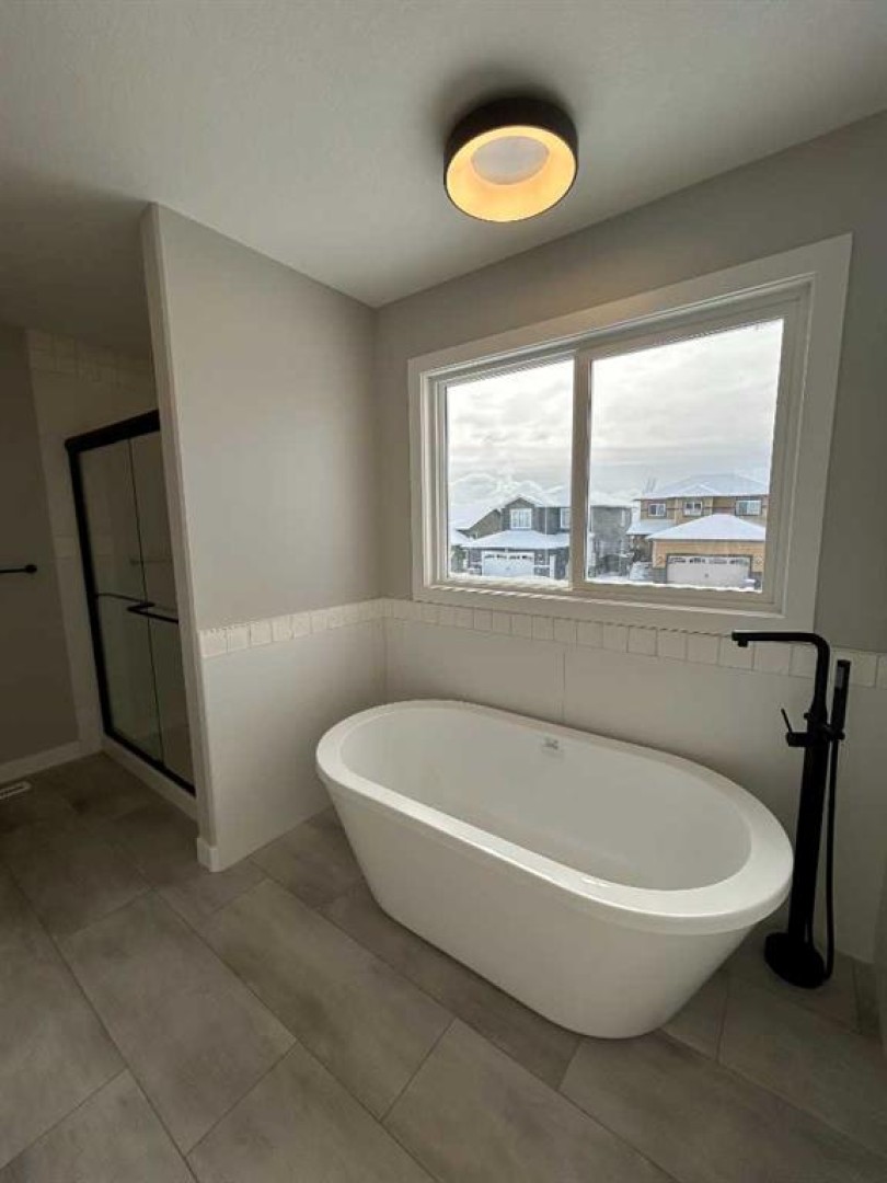Clover Construction Job # 142. 'Hickory' modified bilevel plan with triple garage. Open plan. 3 bedrooms. 2 full bathrooms. Ensuite with double sinks and freestanding tub. Island kitchen. Quartz coutertops throughout. Vinyl tile and plank floors. Vaulted ceiling in living room/kitchen area. Deck. Large fenced pie shaped lot.