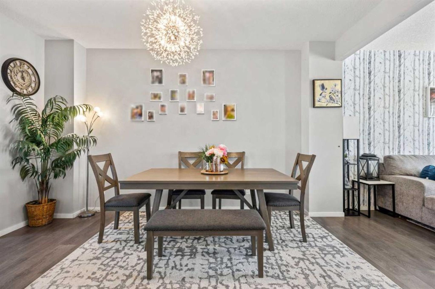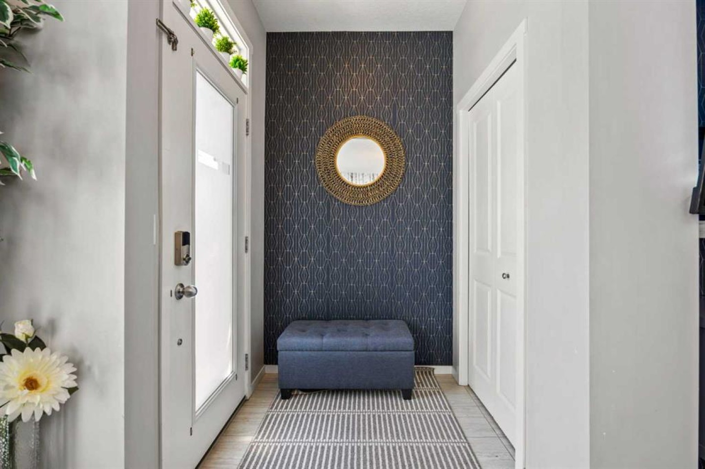 The bright, open-concept main floor is filled with natural light and showcases 9’ knockdown ceilings, wide plank dark vinyl flooring, and modern neutral tones throughout. The inviting living room is highlighted by a stylish feature wallpaper wall, while the thoughtfully designed kitchen is slightly tucked away for added privacy and enhanced with contemporary finishes and its own designer accent wall.