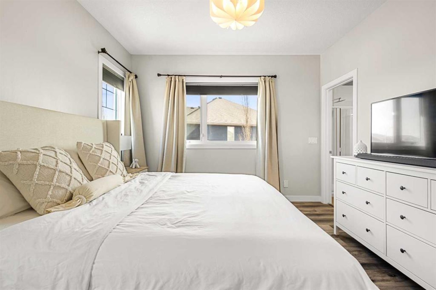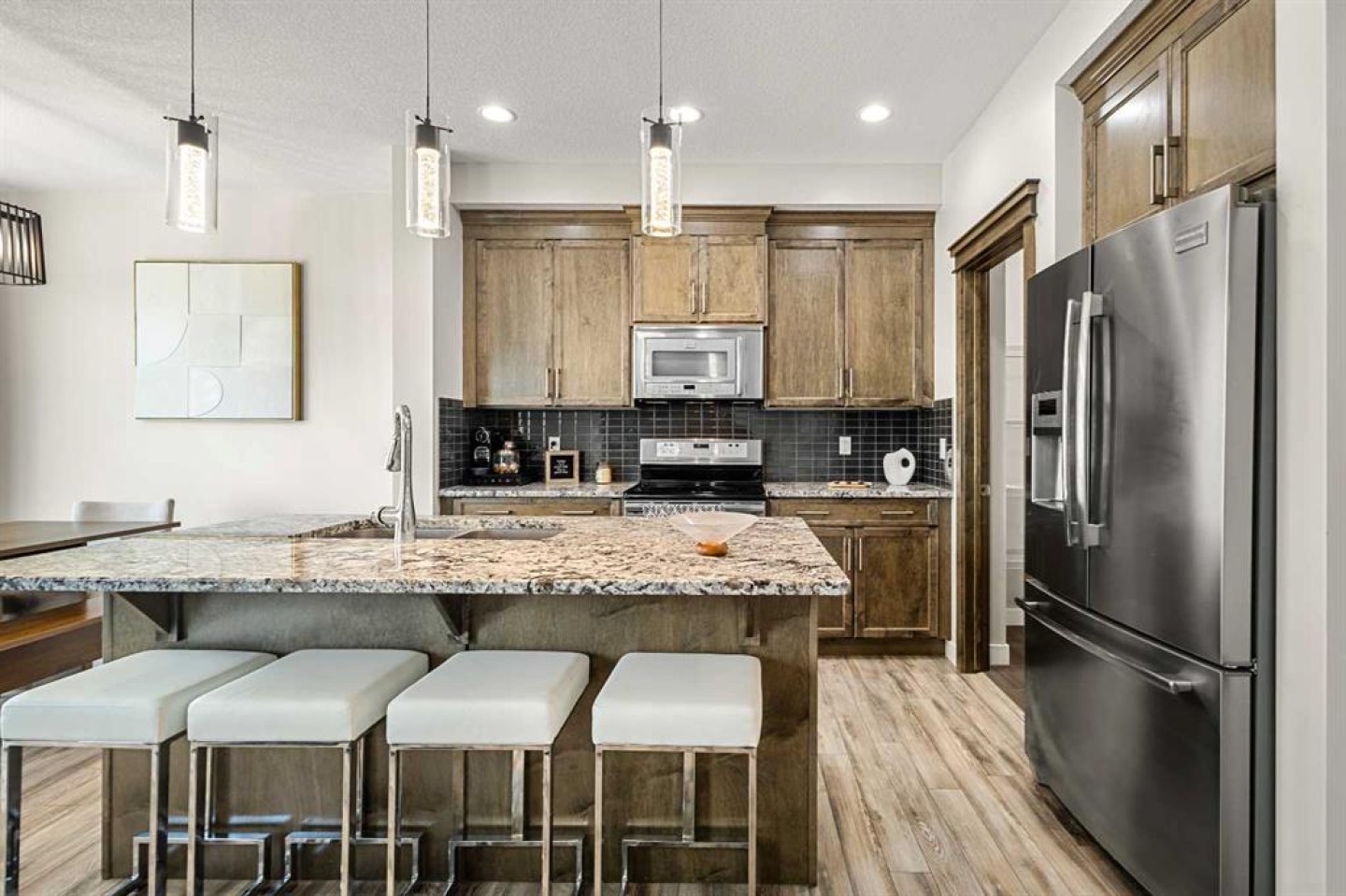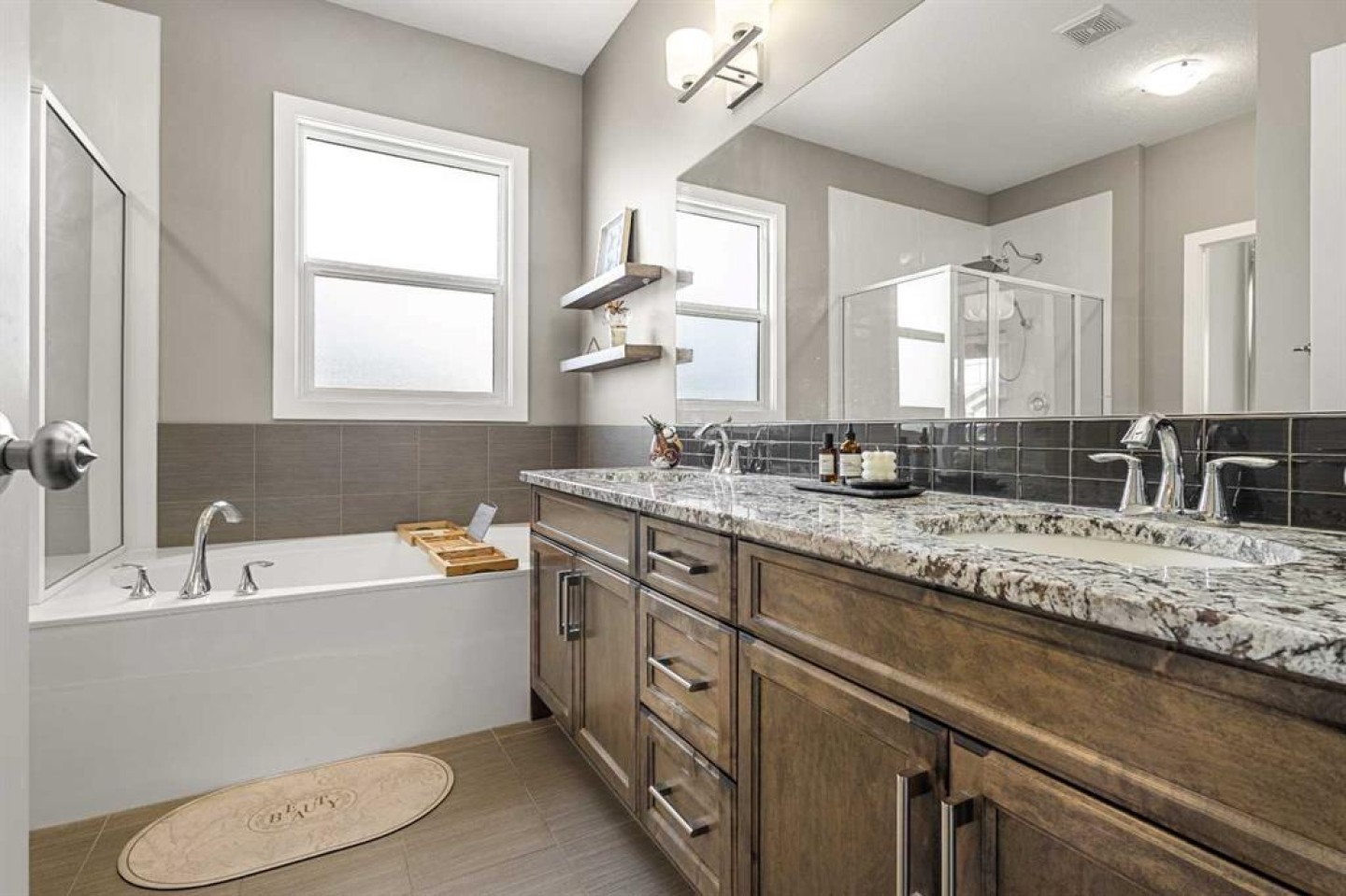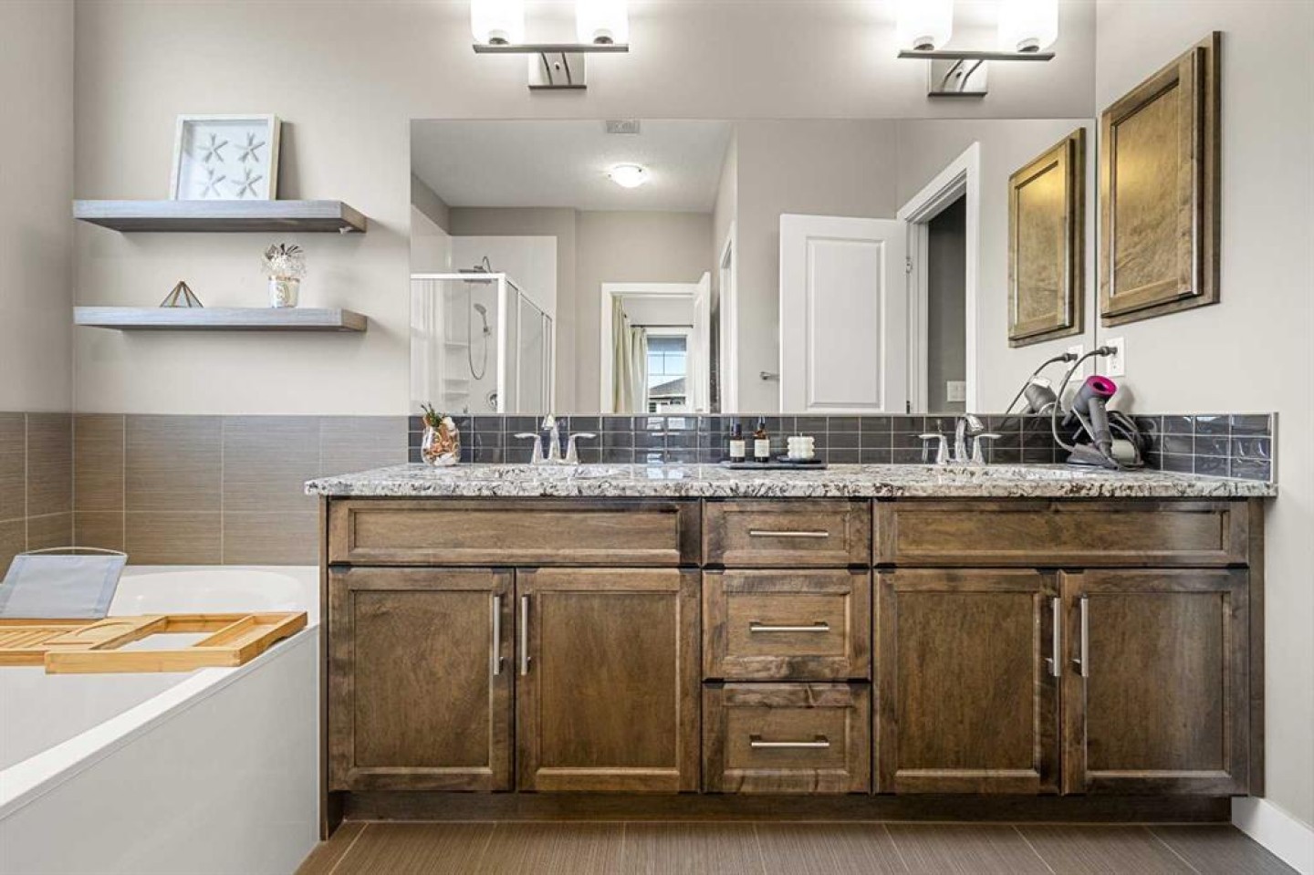 Upstairs, you’ll find three well-appointed bedrooms along with a spacious bonus room—perfect as a secondary living area, home office, or kids’ retreat. The primary suite offers a true escape, featuring a generous walk-in closet and a spa-inspired ensuite complete with dual vanities and heated flooring.